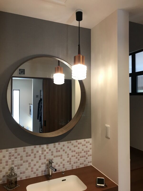 キッチンからは水回りへのアクセスも近道。洗面スペースは、ミラーとブラケットランプを付けていただきました。合わせてデザインしていただいた造作家具は来客も使う洗面で、自慢できるカッコよさです。