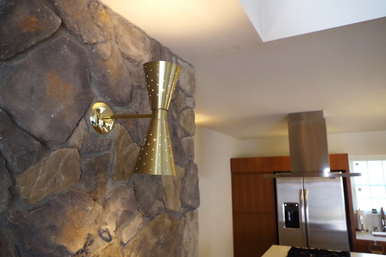 岩壁には抜けを出すミラーとポールランプを設置。ここにも椅子を置けますね。