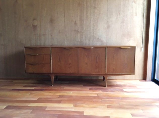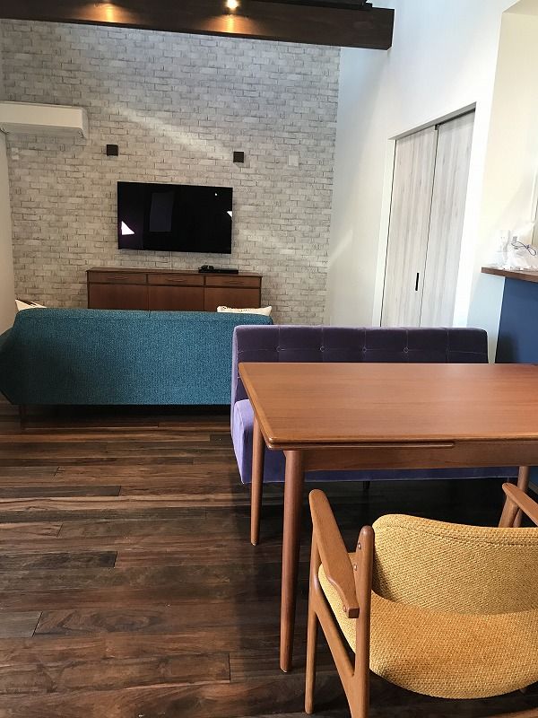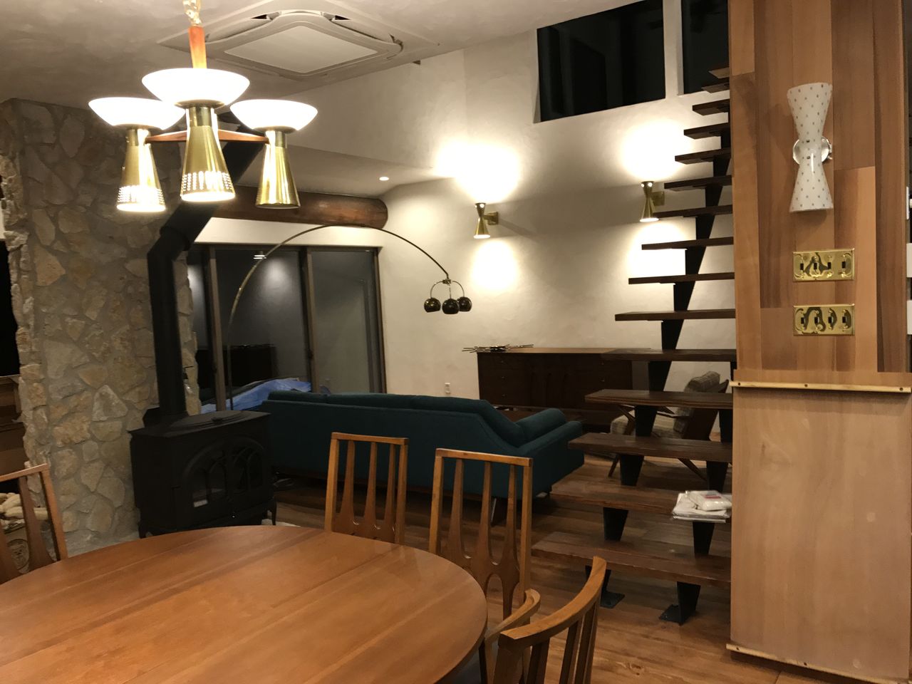 家具はイギリスサイドボードにヘイウッド(US)のラウンドテーブル、50’sステップエンドテーブル、アメリカ製L字ソファ。イギリスとアメリカのビンテージを上手くミックス。