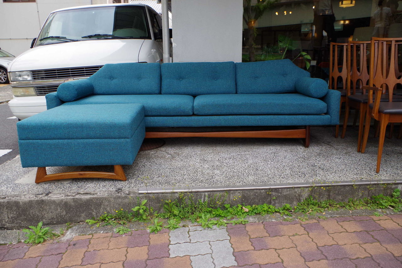 フィフティースらしい丸みのあるL型に、張り替えたラメ入りの生地がとってもかわいくて存在感があるソファ。