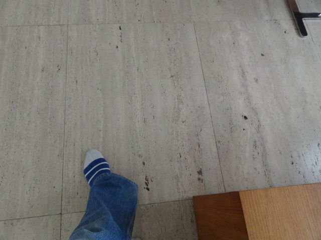 屋根付きテラスで靴を脱がされ、キンキンに冷えた大理石の上を歩くという拷問。