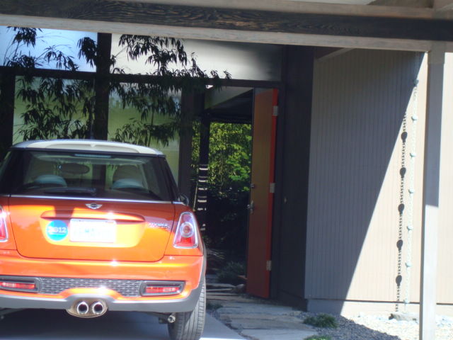 通常、モーテルは部屋のドア前にパーキングがあり、直接部屋に入れるようになっていますが、ここを上手くブロックで囲い、パティオスペースに。