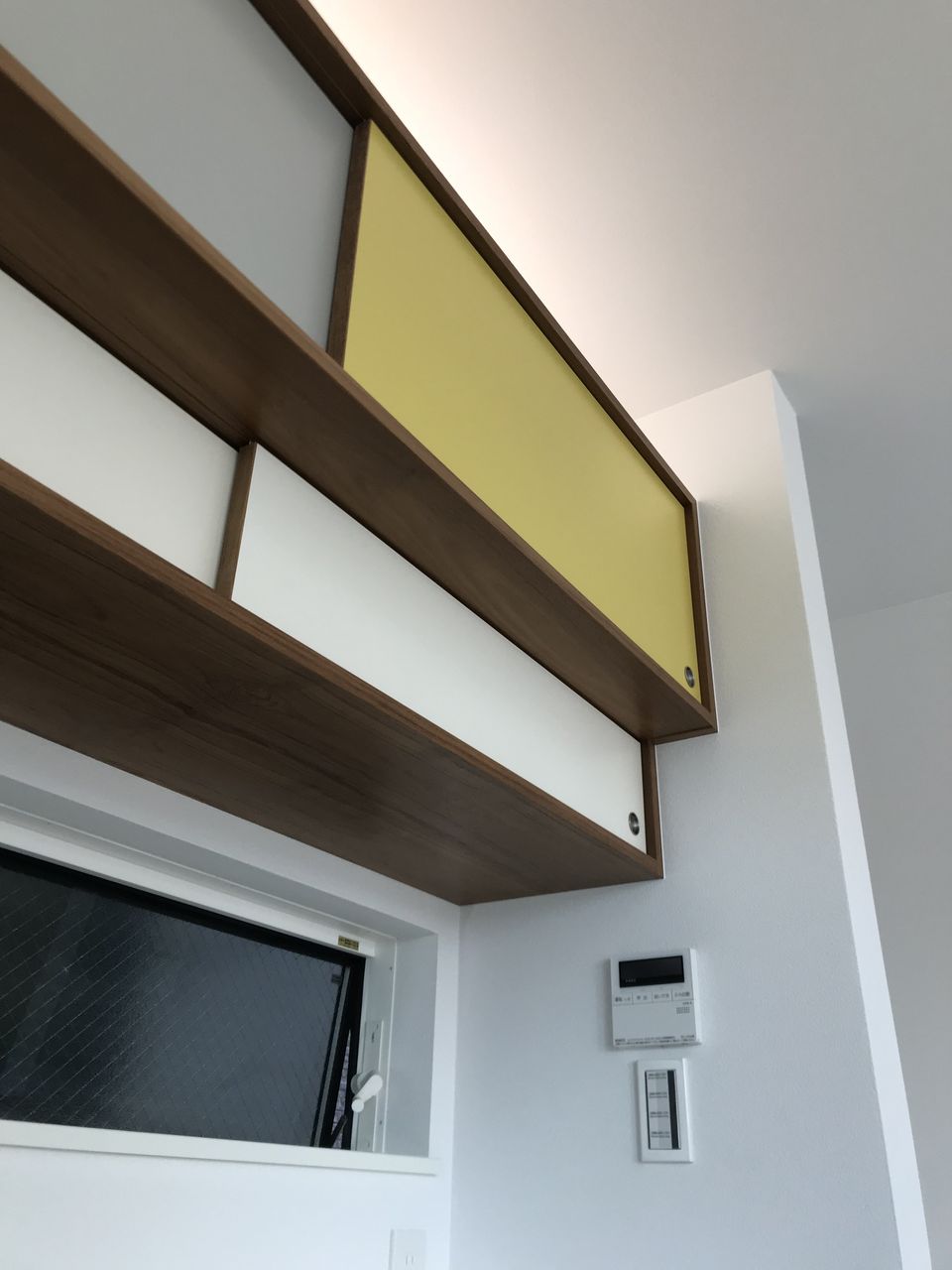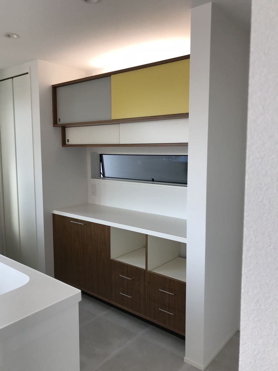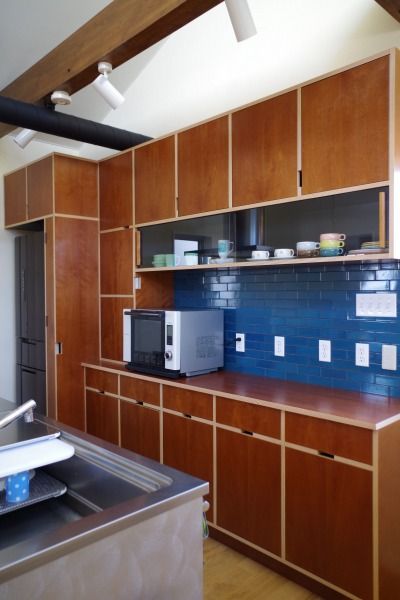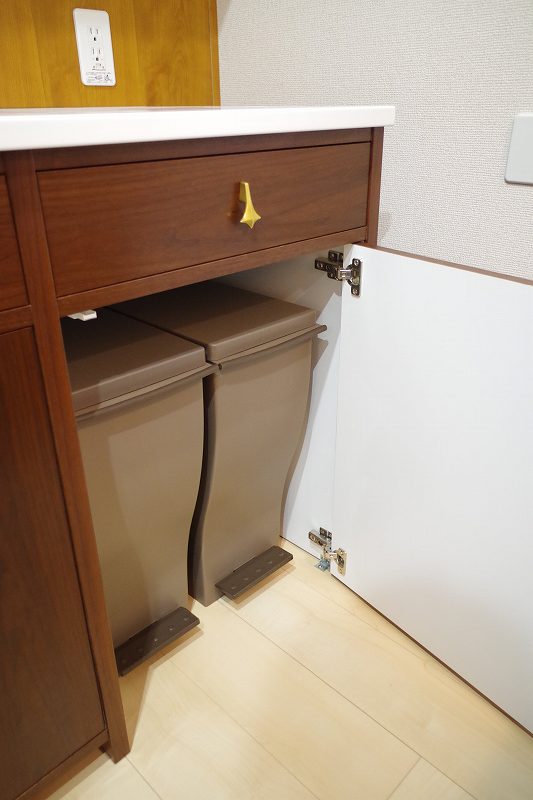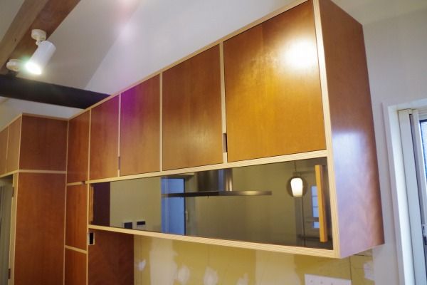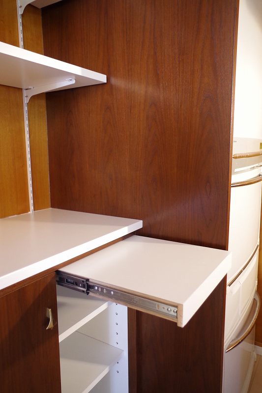 ミッドセンチュリーモダンスタイルで、チーク材突板とセラミック天板で上品なイメージの中、吊棚が逆台形の当時の特長を押さえたあそび心を感じるデザインになりました。