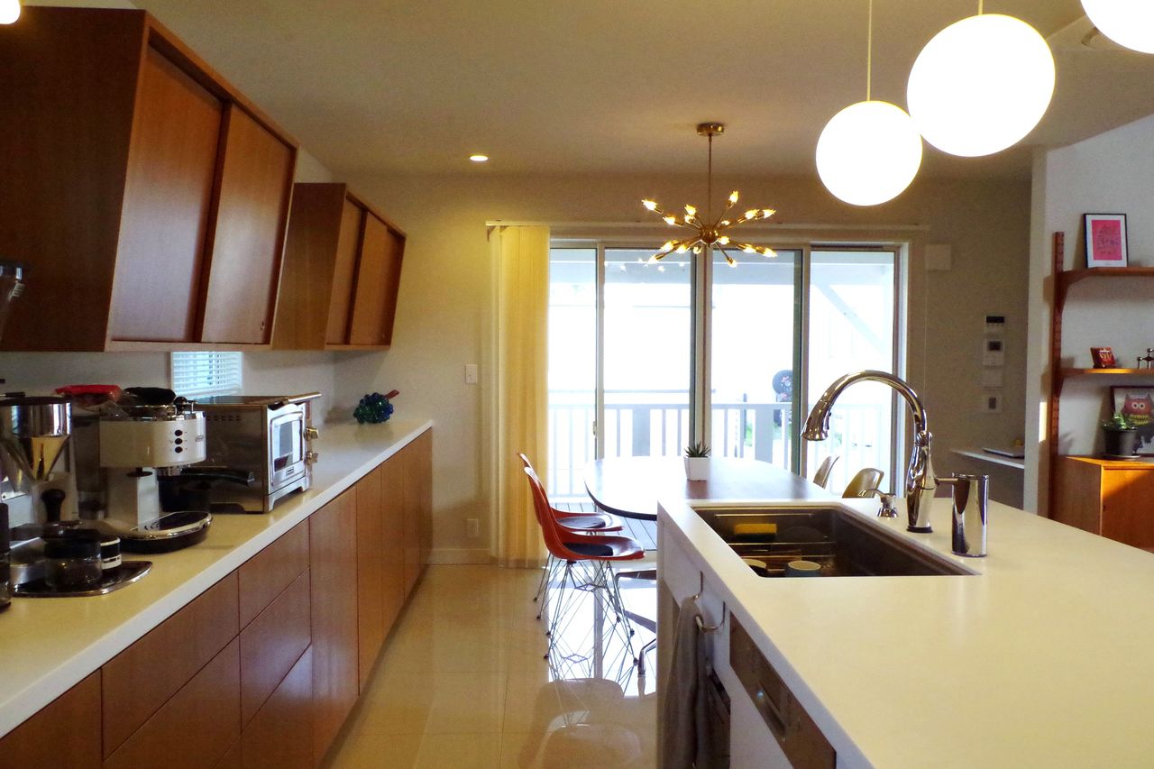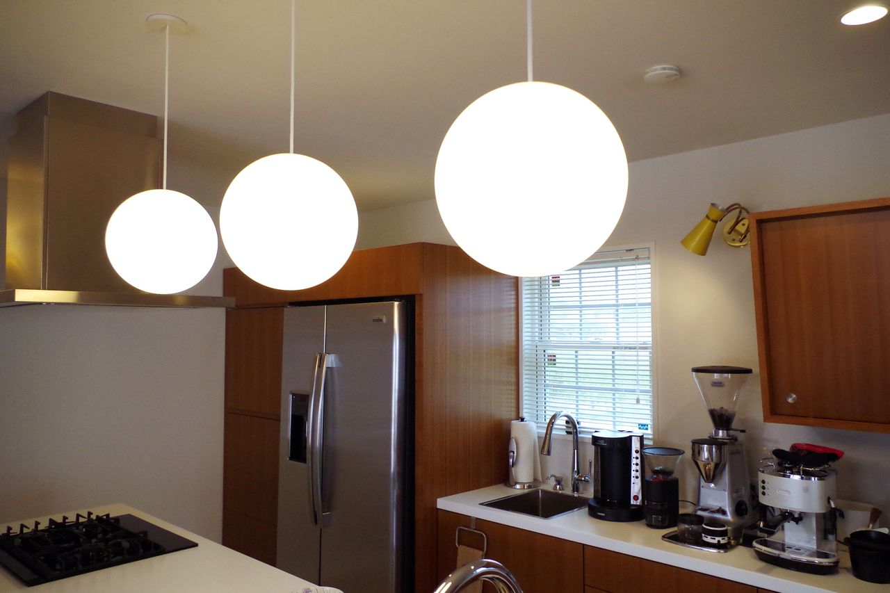アイランドの上にはミッドセンチュリーモダンの代表的で、それでいてとてもシンプルな、白球の照明が3個付けられています。
