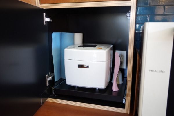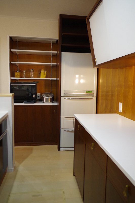 電子レンジや炊飯器も冷蔵庫横に入れ込みキッチンの見せない家電を収納。