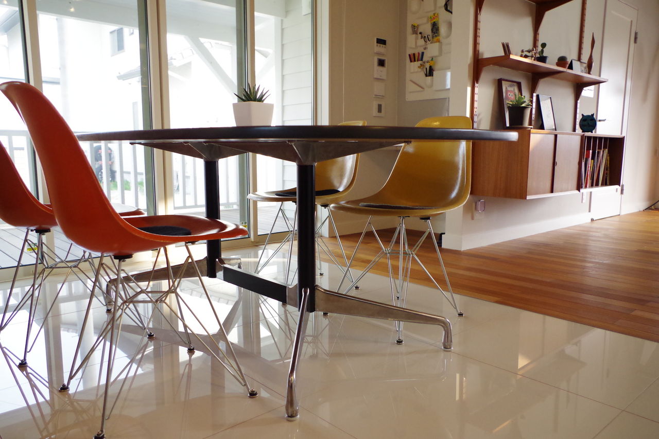 背面収納の長さはなんと6m。キッチンと繋がったダイニングエリアにはイームズを揃えていただきました。突板の面が壁のようになっていますので、テーブルの脚はあえて金属製のもので軽快に。ファイバーグラスのイームズが良い崩しアイテムになっています。