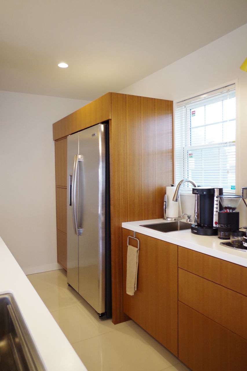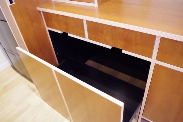 LDKがひと続きになっている場合、キッチンの生活感がリビングに影響しがちですが、家電に負けない迫力のオーダーメイドの家具のおかげで、ゆったりとしたキッチンに仕上がりました。