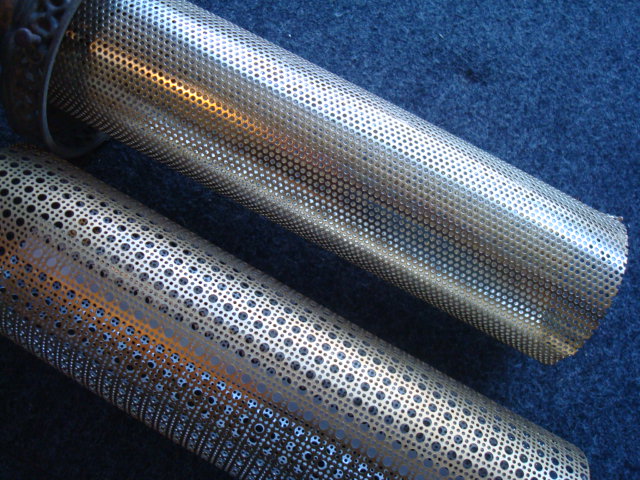 ビンテージガラスランプにはランプの中にディヒューザーというものが入っているものもあるのですが、電球の光を拡散させるため、金属の筒に穴を無数にあけたものなのです。ちょうど水面に太陽の光があたってキラキラ輝くような、そんな効果があります。