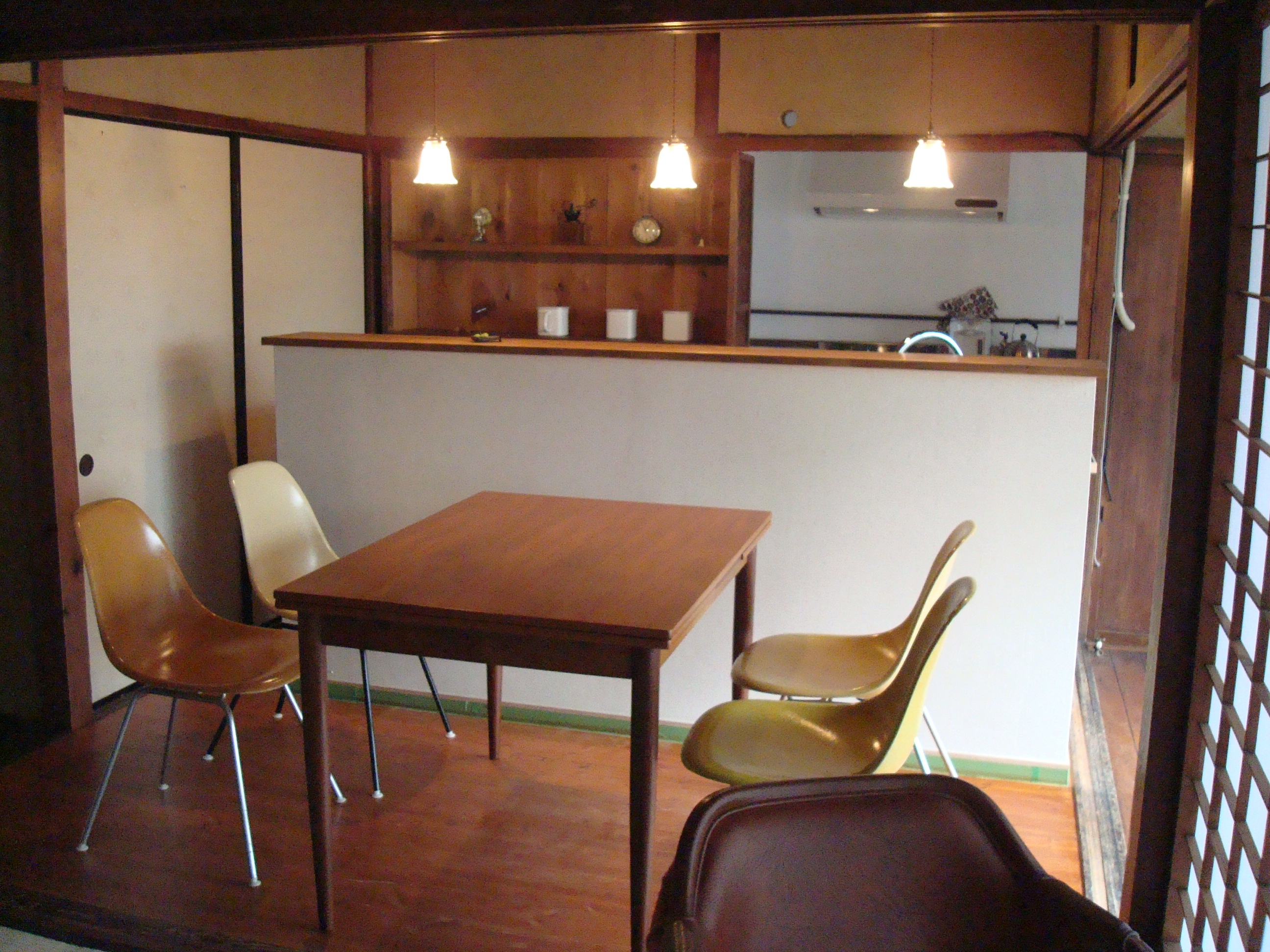 中のテーブルやイスは、日本とデンマークとアメリカのミックス。これだけ距離のある国々なのに、違和感なく収まっています。それはデザイナーでもあるオーナーの色彩感覚が古民家に合うようなハーマンミラーのカラーをチョイスしているという理由と、年代が似通っているからですね。