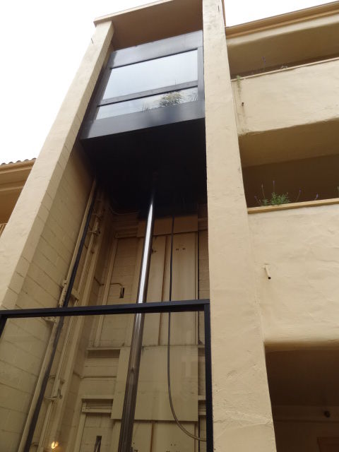 その反対側(山側)のエントランスから、黒い鉄骨の骨格にオレンジと白のパネルが植物の間から見えます。
