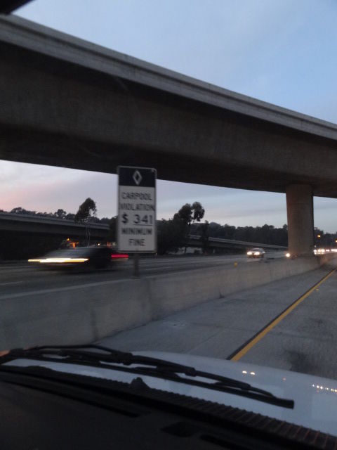 この写真の左側の看板に「CARPOOL」という文字が見えるかと思います。この車線は2人以上人が乗っていると走れる車線で、写真では結構走ってますが、普段はガラガラで、混んでいる左側車線を横目に、優越感の味わえる車線なのです。