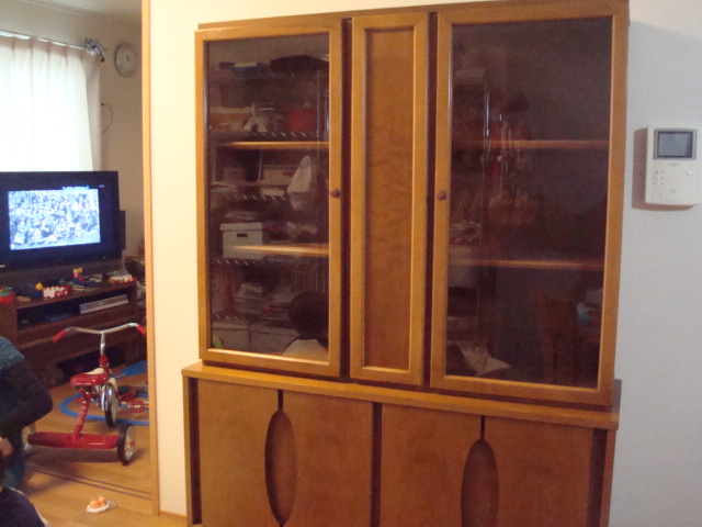 お嫁に行ったのはカップボード。一体型タイプだったので、お届けに苦労するかも…と不安だったのですが、1階で設置場所まで比較的近くだったので、安心?したのもつかの間…。ちょっと斜めにした途端、バランスが崩れて倒れそうになってしまいました。