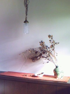 玄関には奥様お気に入りのコーナー。アンティークのガラスランプに、ドライフラワーを生けてある花瓶は大好きな陶芸家さんの作品だそうです。